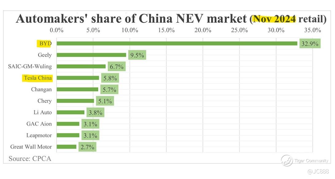 In November 2024, of all the EVs sold in China, 32.9% were BYD registered vs Tesla Motors (TSLA)$ 5.8% and Li Auto (LI)$ 3.8%.