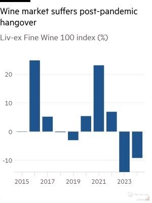 Fine wines are hitting a sour patch. The Liv-ex Fine Wine 100 Index, the global benchmark for wine investments, is down 9.2% in 2024, marking a second consecutive year of decline. Burgundy plunged 14.4%, Champagne fizzled out at 9.8%, and Bordeaux tumbled 11.3%. Itβs a stark contrast to the pandemic boom when vintage Champagne outpaced tech stocks!