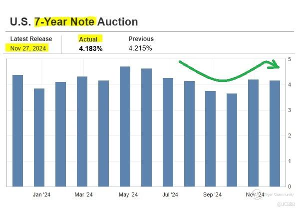 The most recent 7-year note auction on 27 Nov 2024, saw moderate investor demand. (see above)