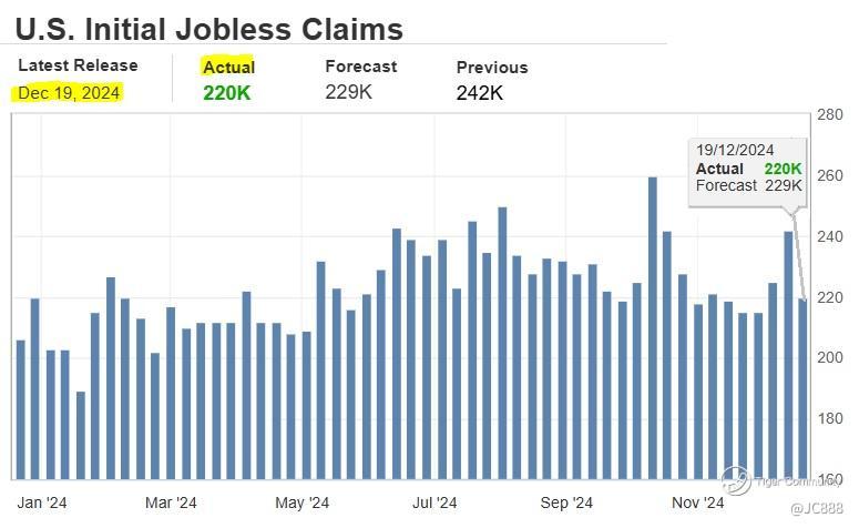 For week ended 14 Dec 2024, initial claims decreased by -22,000 to 220,000 versus economists’ expectations of 230,000 claims. (see below)