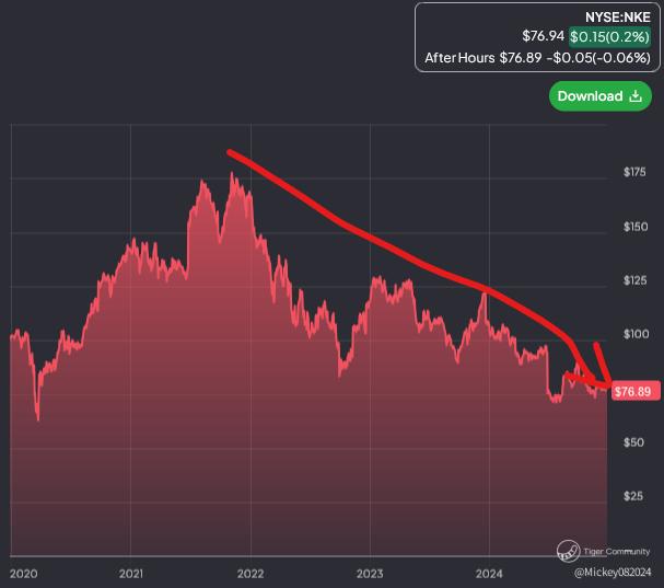Today is my update on Nike stock, so let’s dive into it. The stock has been a significant disappointment, experiencing a consistent downtrend since its peak around $170–$175 per share in 2021. As shown in the chart, this decline has been relentless.