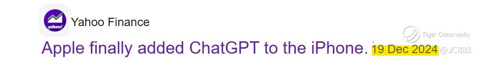 All that changed when it was announced on 19 Dec 2024 that AAPL will finally add ChatGPT to its flagship product - the iPhone.