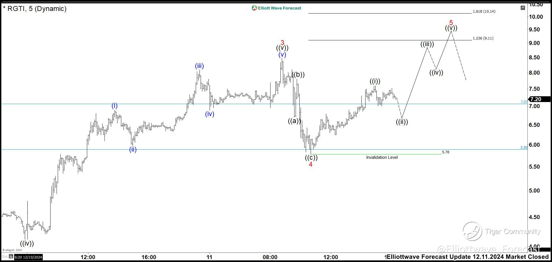 RGTI found support at 5.78 low and rallied. From here, we are looking to build an impulse structure as wave 5. Wave ((i)) could be completed already and while the pullback as wave ((ii)) is above 5.78 low, RGTI should continue higher. The target for this wave 5 comes in 9.11 -10.14 if there is not more extension in the rally.