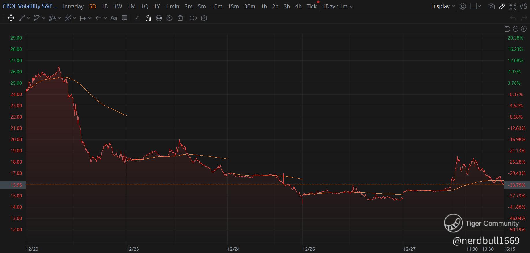 The market faced broad selling pressure on Friday, with the Dow Jones Industrial Average dropping over 500 points at its low and closing 333 points down. The S&P 500 fell by 1.1%, and the Nasdaq Composite declined by 1.5%. The retreat was marked by profit-taking as the year-end approached, and significant declines in mega caps impacted overall performance. The CBOE Volatility Index rose to 16.10, indicating heightened market volatility expectations.