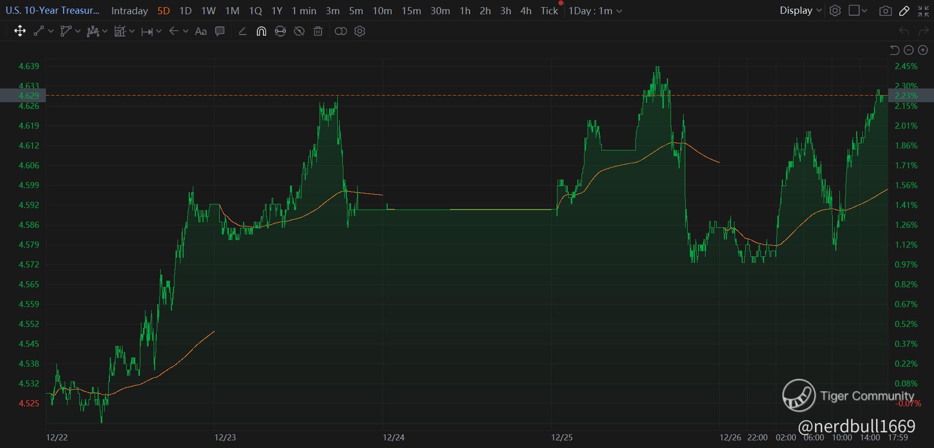 The yield on 10 year Treasurys, which is correlated with expectations about where interest rates are headed, was at 4.63% in recent trading, up from 4.58% yesterday and near its highest levels since May.