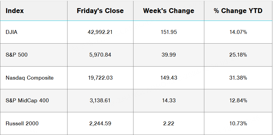 Major stock indexes produced moderate gains in the final full week of the year. The relatively quiet week started with a continuation of the previous Fridayβs move in a rally largely driven by large-cap growth stocks, with the technology-heavy Nasdaq Composite leading the way and the Russell 1000 Growth Index outpacing its value counterpart through Tuesday. However, this trend reversed following Wednesdayβs market closure for Christmas as most indexes declined in the second half of the week, giving back some of their earlier gains.