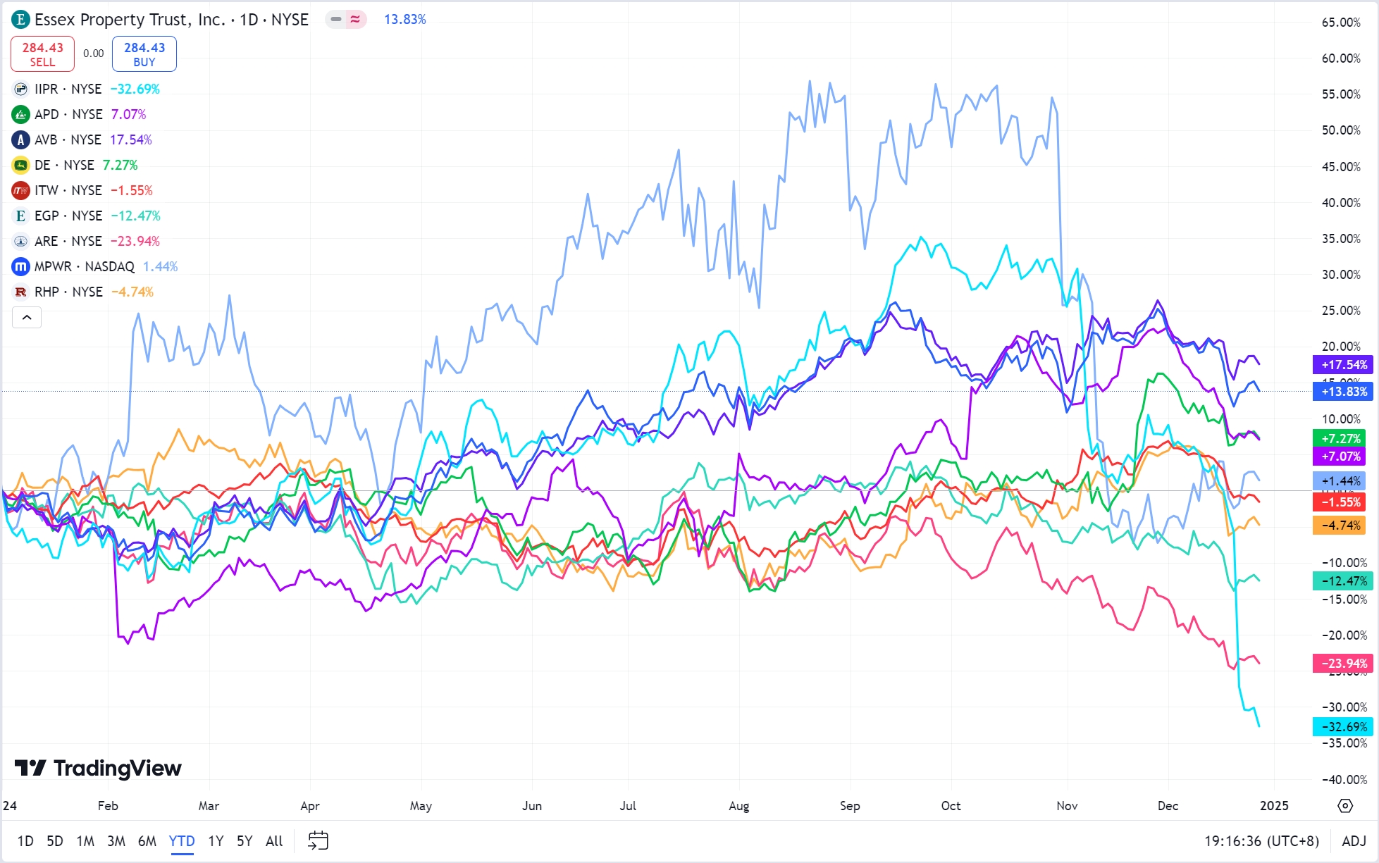 According to TradingView data, the stock prices of companies including $Essex Property(ESS)$ , $Air Products & Chemicals(APD)$ , $AvalonBay Communities(AVB)$ , $John Deere(DE)$ , and $Monolithic Power(MPWR)$ have risen in 2024. On theother hand, declines were observed in the prices of $Innovative Industrial Properties Inc(IIPR)$ , $Illinois Tool(ITW)$, $EastGroup Properties(EGP)$ , $Alexandria Real Estate Equities(ARE)$ and $Ryman Hospitality Properties(RHP)$ .
