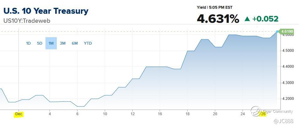 On Fri, 27 Dec 2024, yield on the benchmark 10-year Treasury rose more than 4 basis points to 4.631% after the rate hit its highest level since May in the previous session. (see above)