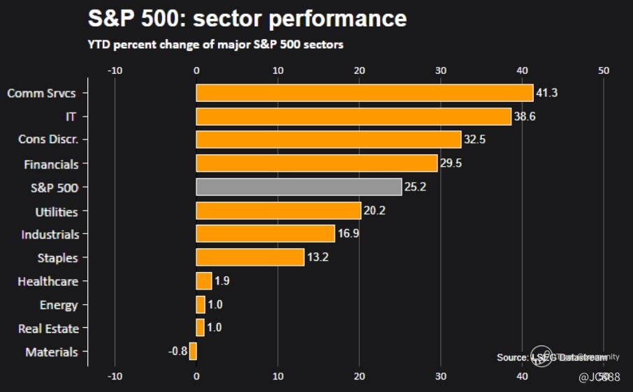 Technology (XLK), Communication services (XLC), and Consumer discretionary (XLY) were on course to notch gains of nearly +30% or more.