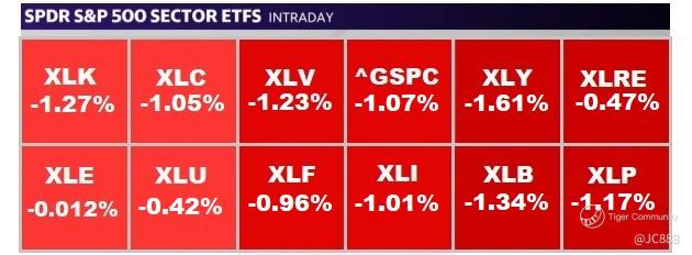 All 11 major sectors of S&P 500 lost ground on Monday, with Consumer discretionary (XLY), suffered the largest percentage decline, falling -1.61%.