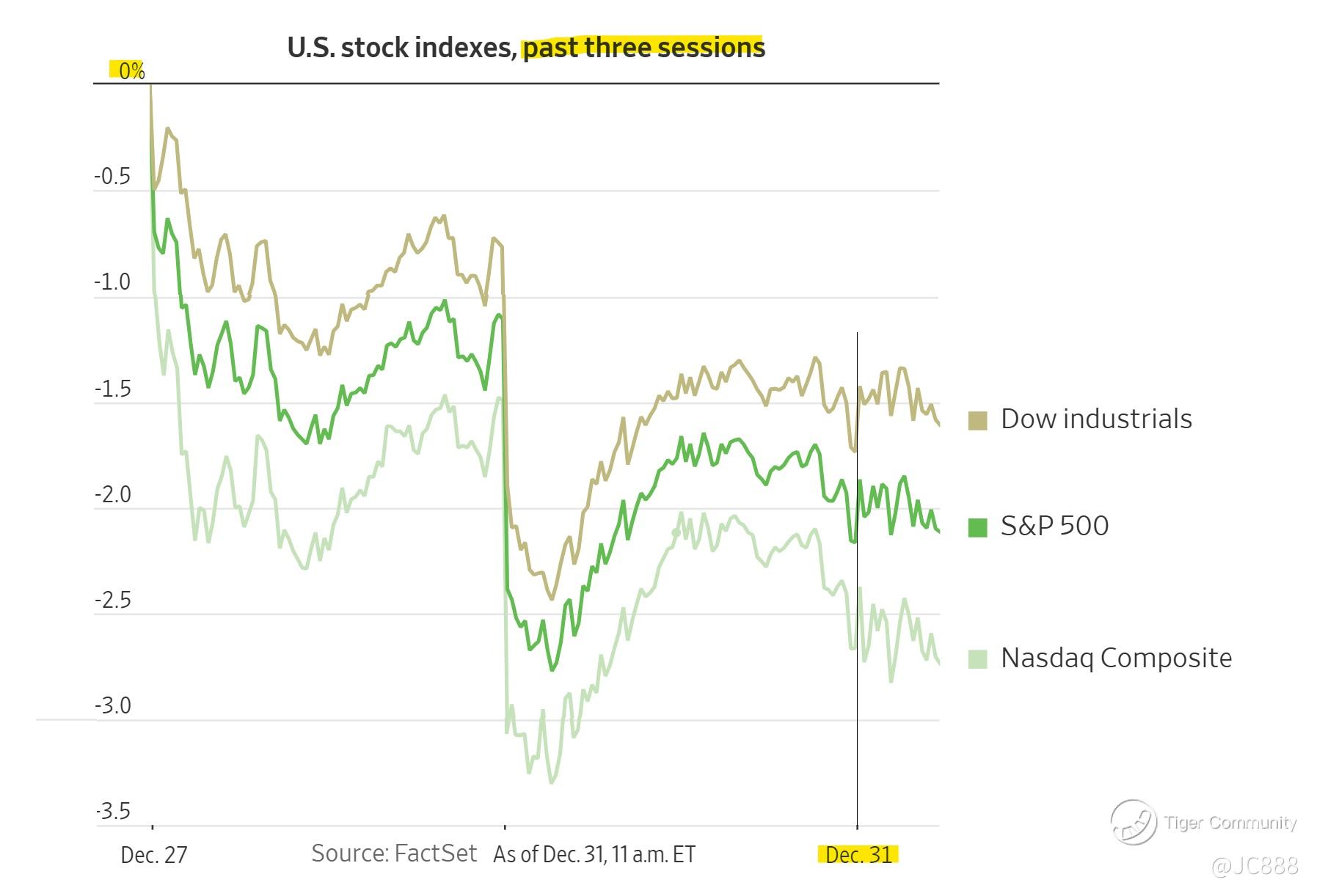 On Wall Street, major US stock indexes ended Tuesday’s session in the red, after oscillating between small gains and losses early in the session, ending a languid, low-volume session that contrasted with the tumultuous year that preceded it.
