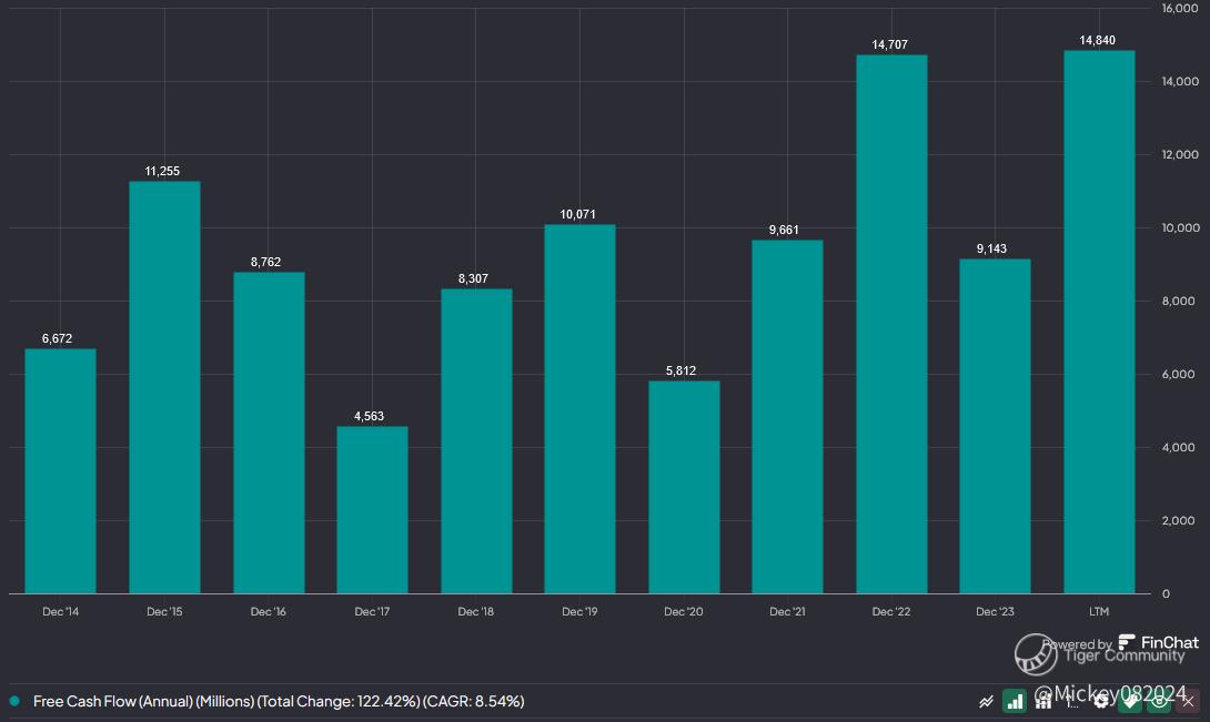 Net Income to FCF Conversion: Using a net income-to-FCF conversion ratio (historically around 80–90%), 2024 FCF could range between $9.6 billion and $10.8 billion.