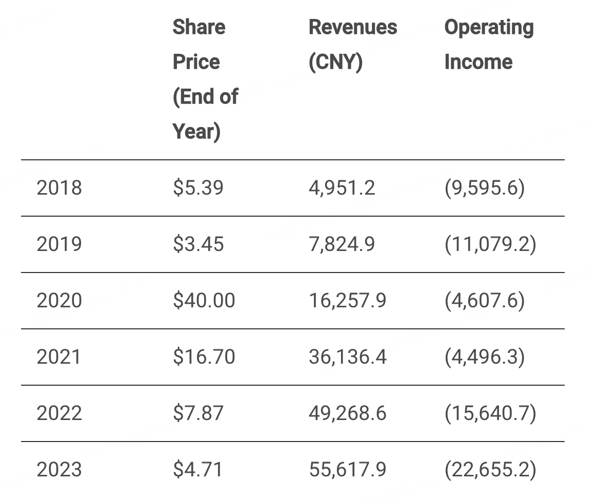 The following is a table of NIO’s revenues, operating income, and share price for the first few years as a public company.