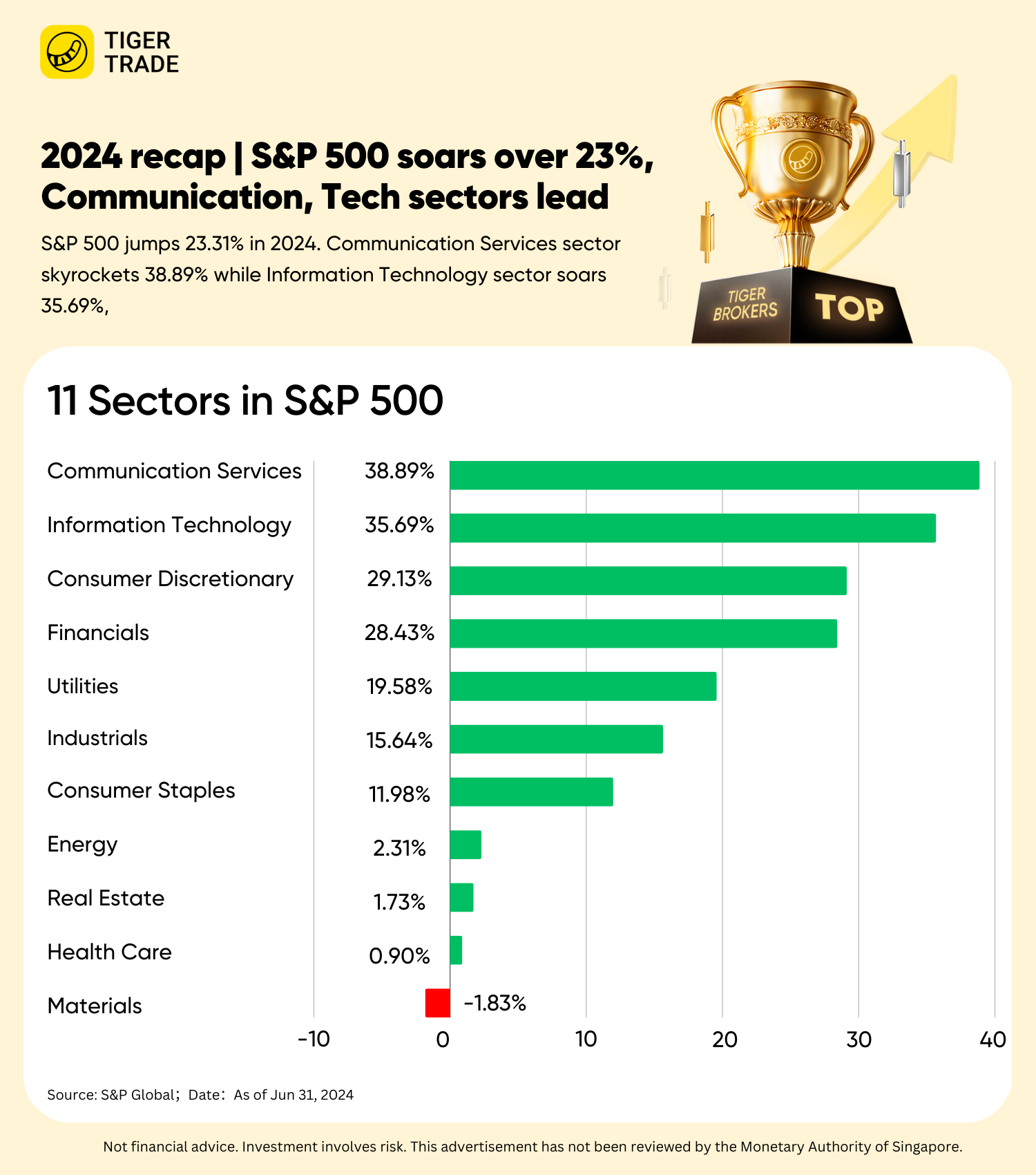 For 2024, The communication services sector was the top-performing S&P 500 sectors with a nearly 39% growth, followed by the information technology sector. Ten of the 11 sectors posted the year gains, with materials sector being the sole decliner.