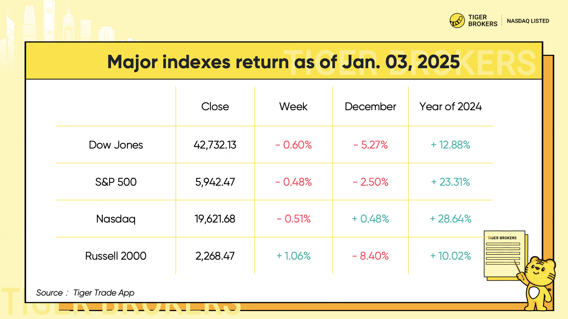 The market cooled in the final weeks of 2024, but the averages are still not too far from record highs after a strong year for Wall Street. For December, the benchmark lost 2.5%, while the Dow was down 5.27%. The tech-heavy Nasdaq became the only positive average over December with a 0.48% up.