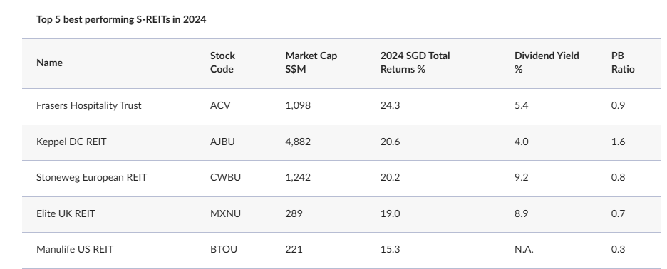 The five best performing S-REITs in 2024 in SGD terms were $Frasers HTrust(ACV.SI)$ (+24.3% total returns), $Keppel DC Reit(AJBU.SI)$ (+20.6%), $Cromwell Reit EUR(CWBU.SI)$ (+20.2%), $EliteComREIT GBP(MXNU.SI)$ (+19.0%), and $ManulifeReit USD(BTOU.SI)$ (+15.3%).