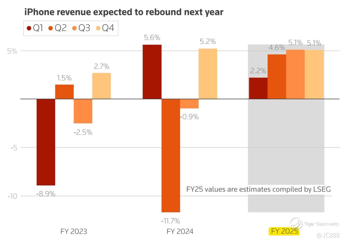 However, LSEG data showed analysts expect revenue from iPhones to rebound in 2025. (see below)