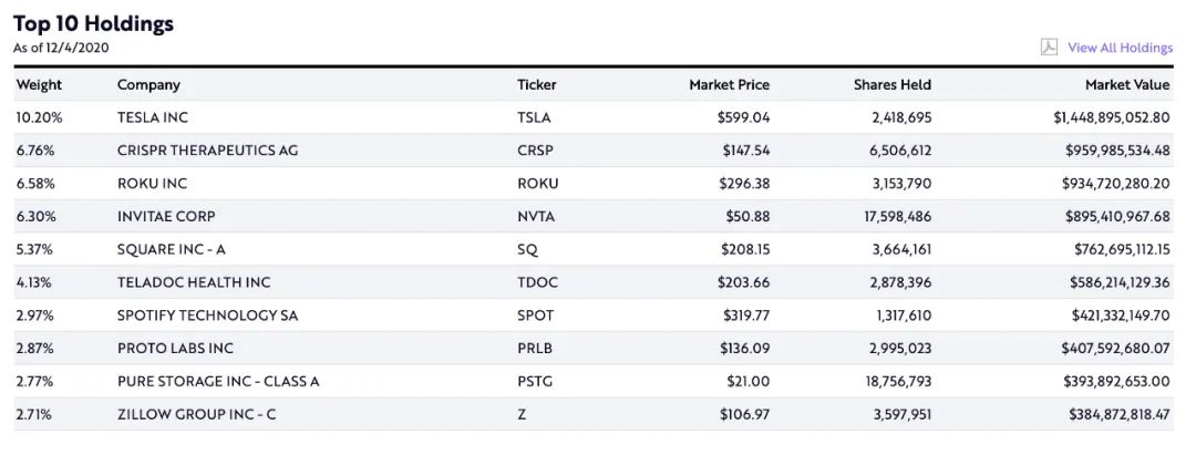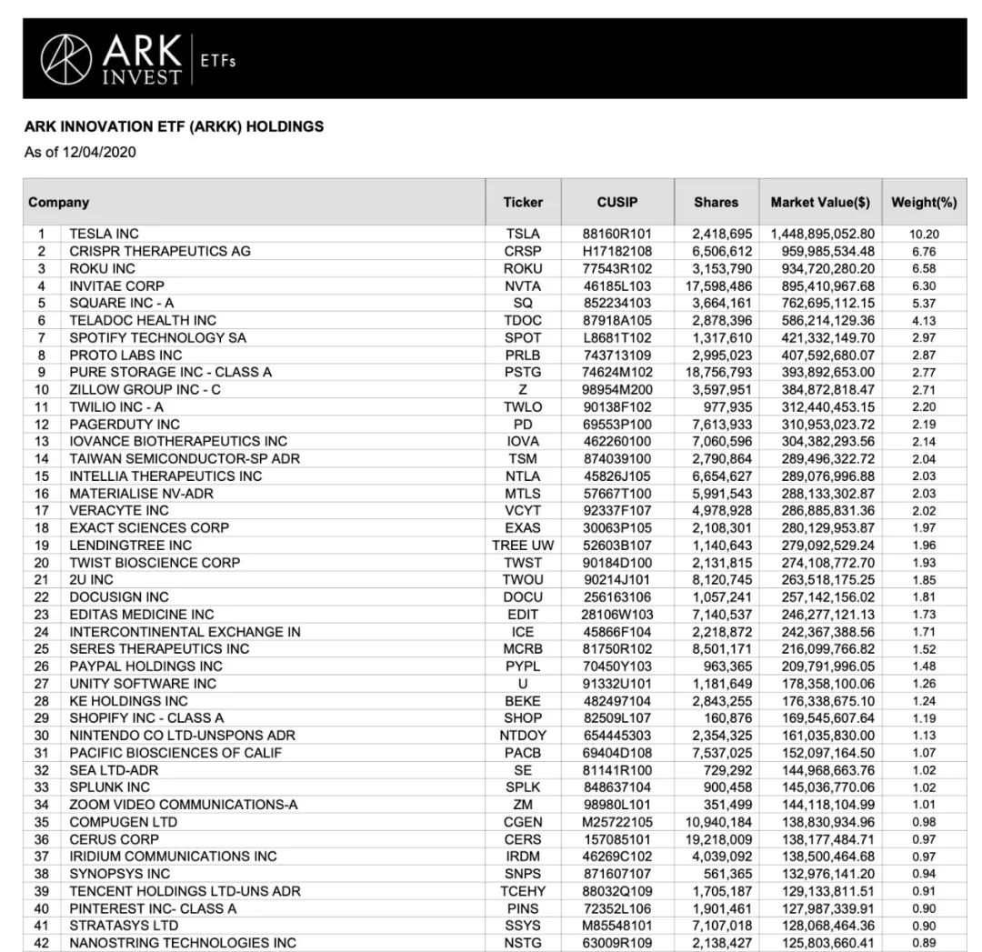 2020年12月4日 ARK旗下創新ETF(ARKK)的持倉明細 每個交易日都會更新