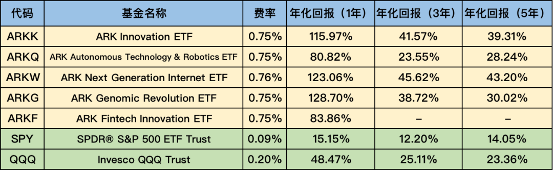 ARK旗下五款主動型基金與SPY和QQQ的費率和業績對比