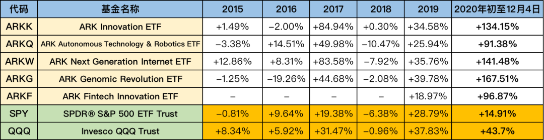 ARK旗下五款主動型基金與SPY和QQQ在2015年以來每年的漲幅對比