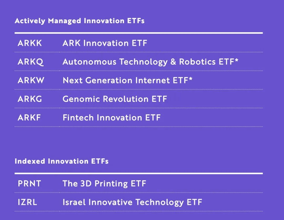 ARK目前有7個產品,其中有五個是主動基金、兩個是被動基金,這兩個被動基金一個是3D打印ETF,一個是以色列科技ETF,由於這兩個產品比較小衆,我們今天主要看看另外5個主動基金。