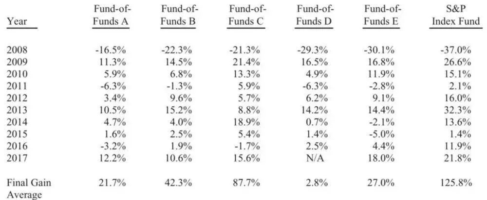 五隻FOF基金和標普500指數基金在十年賭約中的表現,全部輸給標普500