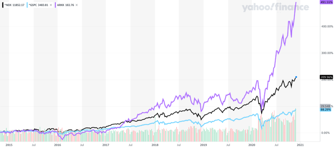 上面這張圖中紫色線爲她管理的一隻規模最大的ARKK與納斯達克100(黑色線)以及標普500(黑色)的對比,從2014下半年登場至今,ARKK累計上漲了接近500%,碾壓基準標普500,甚至也讓作爲科技指數之王的納斯達克100相形見絀。ARKK連續三年都跑贏了基準,並且和其他ARK旗下的四個主動基金一同在今年迎來了大爆發。