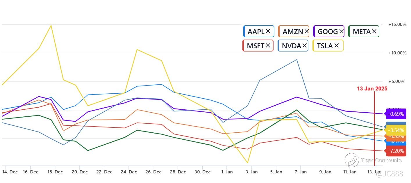 So, big tech stocks, including the Magnificent Seven, were lower on Monday (except $Tesla Motors(TSLA)$) despite paring early losses. (see below)