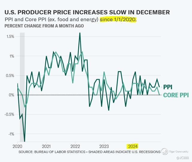 US Producer inflation (reported by the Labor Department) rose less than expected in December 2024, as higher costs for goods were partially offset by stable services prices.