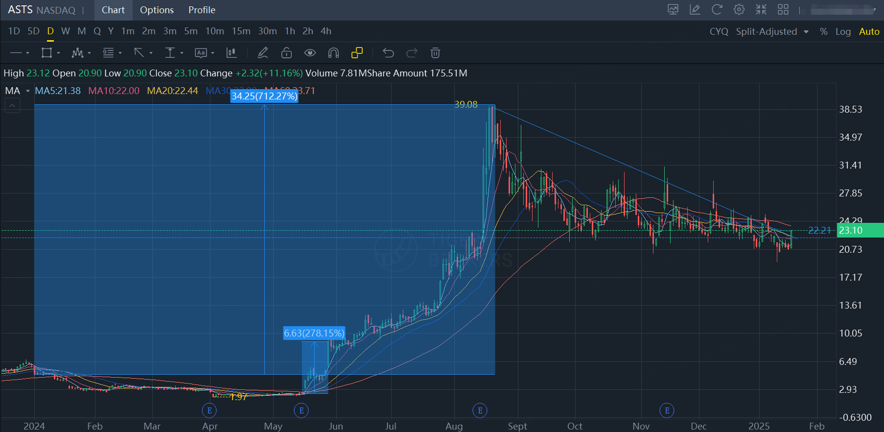 ASTS rose more than 700% in 2024, mainly starting in May, when $Verizon(VZ)$ and $AT&T Inc(T)$ were both investing heavily with AST SpaceMobile in a bid to challenge Elon Musk's SpaceX.