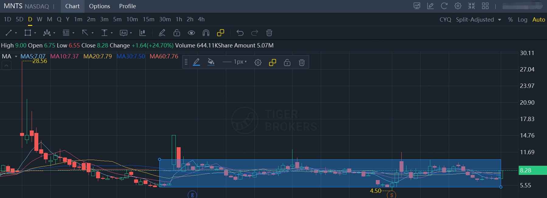3. $Momentus Inc.(MNTS)$ soared 22%, a nice candle, but still fluctuating within the price box.