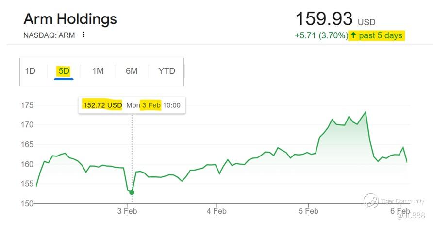 On Wed, 05 Feb 2025, it closed up +6.8% but all too soon, Arm’s shares fell more than -6% in after-hours trading. (see below)