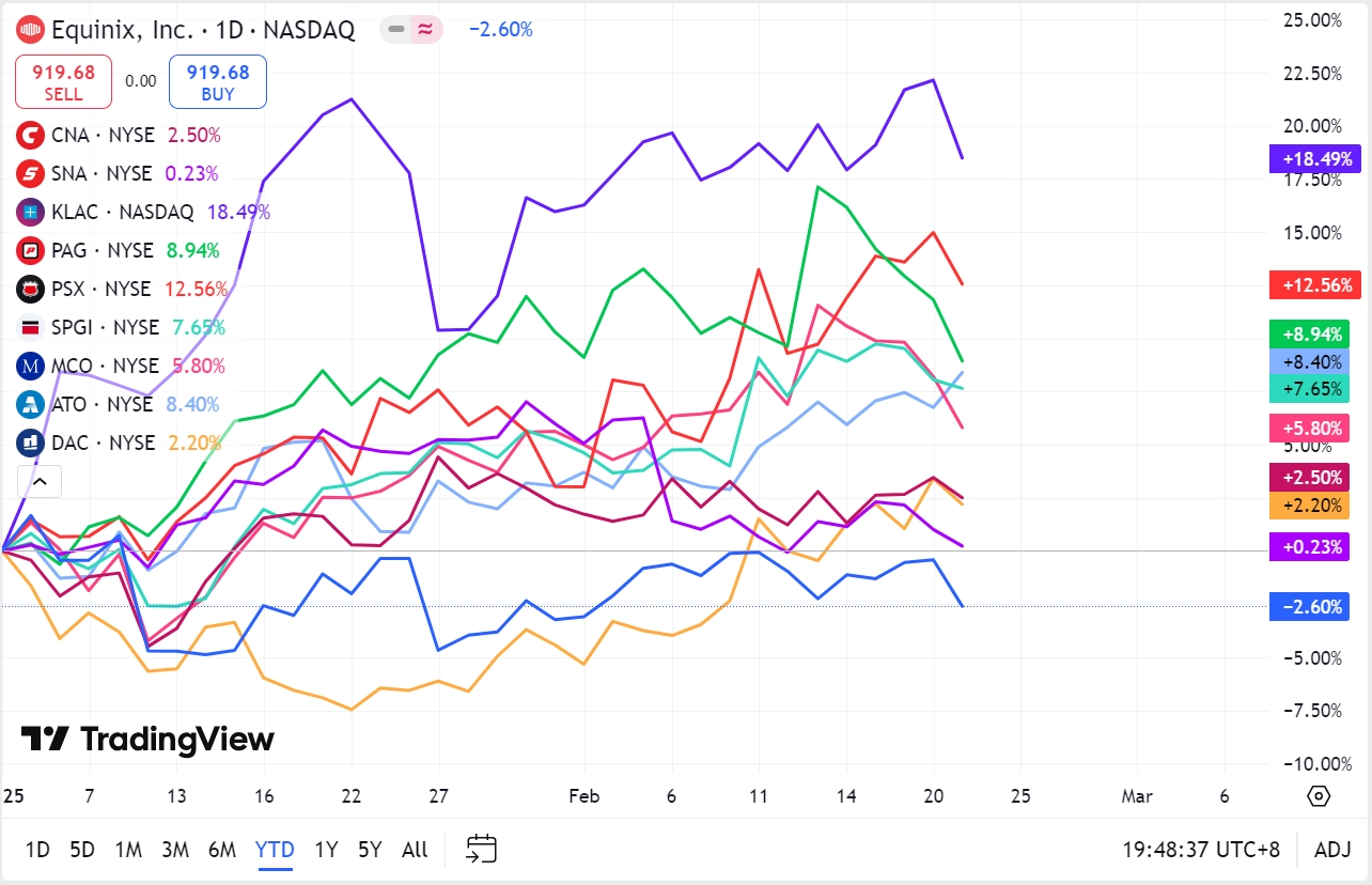 TradingView data from 2025 indicates that the stock prices of companies such as $CNA Financial Corp(CNA)$ , $Snap-on(SNA)$ , $KLA-Tencor(KLAC)$ , $Penske(PAG)$ , $Phillips 66(PSX)$ , $S&P Global(SPGI)$ , $Moody's(MCO)$ , $Atmos(ATO)$ , and $Danaos(DAC)$ trended upward, whereas $Equinix(EQIX)$ saw a decline in its share price.