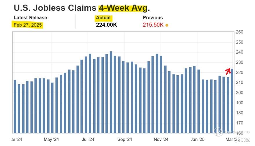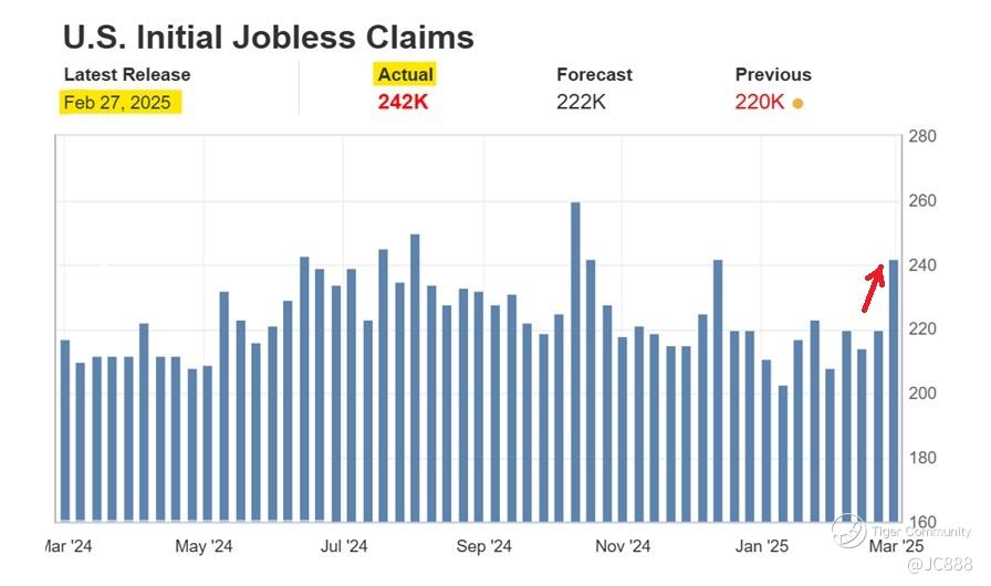 For week ending 22 Feb 2025, US weekly jobless claims jumped 22,000 to a seasonally adjusted 242,000, making the increase was the biggest since October 2024.