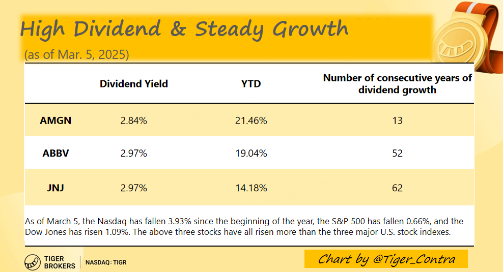 💹 $Amgen(AMGN)$/$AbbVie(ABBV)$/$Johnson & Johnson(JNJ)$: Here are the outperformers, who also offer astonishing dividend yields.