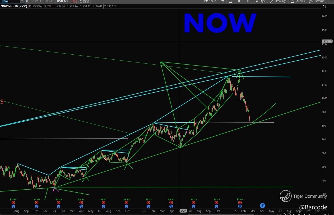 👀✅ I’m adding $NOW to my watchlist for a possible trade on Monday 10Mar25. The stock is currently approaching a critical support level, as indicated by the chart’s green trendlines, which could serve as a foundation for a potential reversal. If broader market sentiment turns positive, a robust upward bounce may be on the horizon, especially given $NOW’s historical resilience and the well-defined technical structure visible in the price action. I’m particularly attentive to signs of a reversal setup, and if momentum starts to build, this could present a compelling risk, reward opportunity for an entry point.