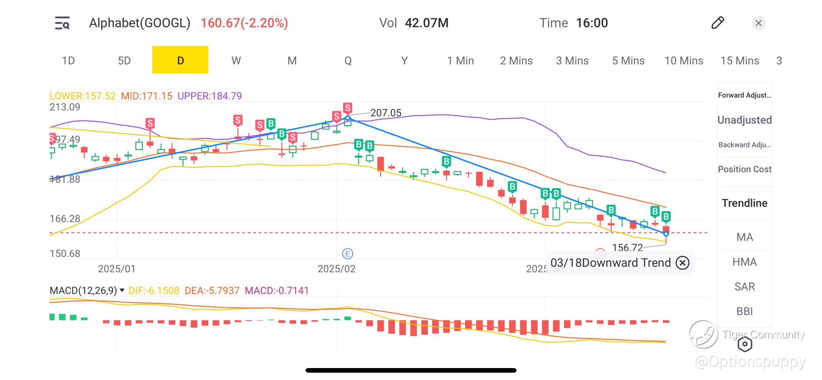 Buying at $158.36 is a smart technical move if you expect a bounce from oversold levels and a potential breakout from the downtrend. If support at $156 fails, you might consider a stop-loss around $150-$152 for risk management.@MillionaireTiger @Daily_Discussion @TigerTradingNotes @MillionaireTiger @MillionaireTiger$Alphabet(GOOGL)$