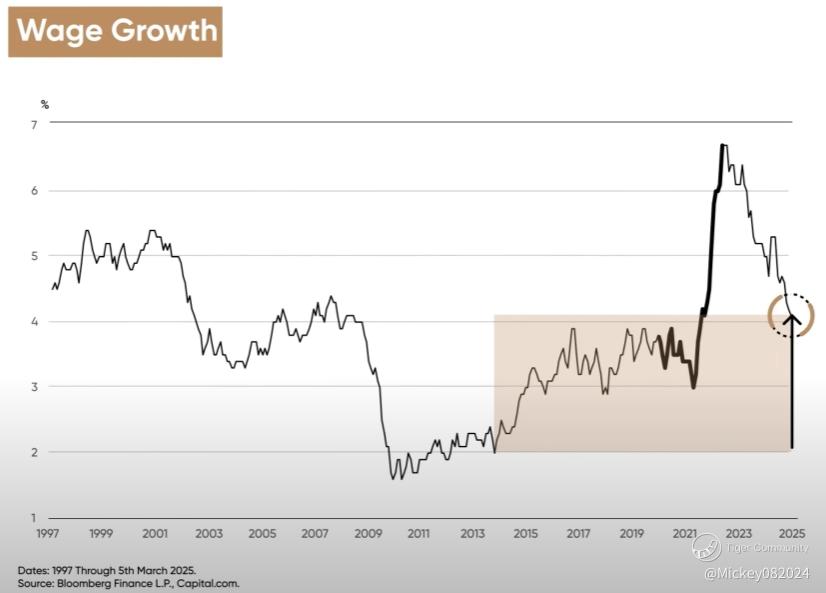 Now, in 2025, this index is once again climbing, which could signal inflation may rise again in the next few months. Upon closer examination, one of the primary drivers behind the ISM Services Prices Paid Index is wages. Since the pandemic in 2020, wage growth has seen a significant increase, reaching its highest levels in 25 years.