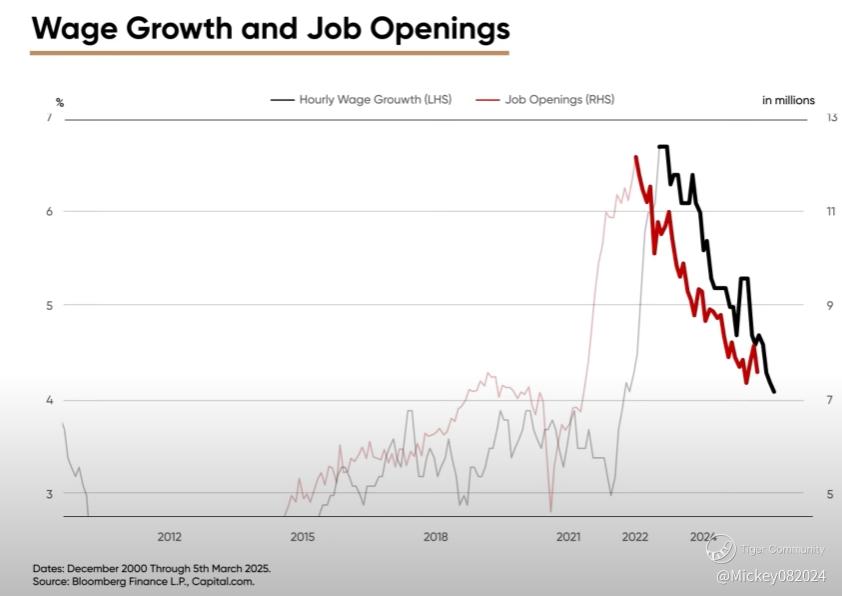 The risk today is that if the FED cuts interest rates too quickly, businesses may resume ramping up hiring, leading to more job openings and higher wage demands, which could reverse efforts to reduce inflation. However, the FED likely understands these risks and has recently adjusted its outlook on interest rates. Back in September 2024, the FED projected six rate cuts for 2025, but in the latest meeting, Powell indicated that only one rate cut is expected in 2025. This shift likely reflects growing concerns over inflation. Even if the FED keeps rates stable at elevated levels, it could help maintain a lid on job openings, similar to the period from May to August of 2008, when the FED held rates steady while job openings continued to decline. A similar scenario could play out today, which would keep downward pressure on wage growth and help curb inflation.
