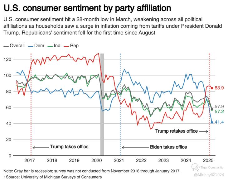 The U.S. Consumer Sentiment Index dropped to a near two-and-a-half-year low in March, with inflation expectations rising. The University of Michigan's latest data shows that consumer sentiment fell by 11% in March, reaching 57.9. This marks the third consecutive month of decline, with drops observed across all demographic groups, including age, education, income, wealth, political affiliation, and geographic regions. Furthermore, long-term inflation expectations increased to 3.9% in March, up from 3.5% in February, reflecting growing concerns about future economic conditions.