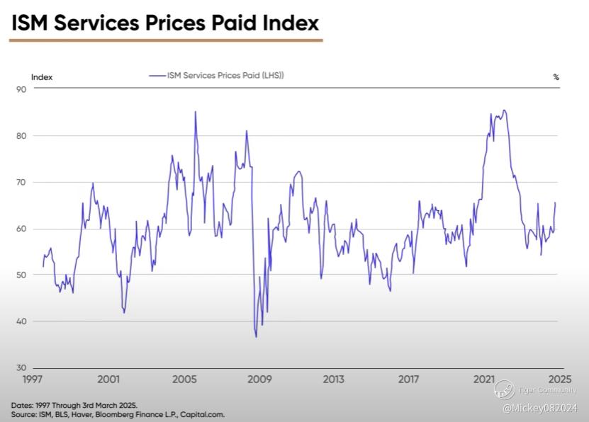 One indicator suggesting inflation might be on the rise is the ISM Services Prices Paid Index, which tracks the fluctuation of business costs—an important factor in driving inflation. A high reading on this index means businesses are facing higher costs, while a low reading suggests costs are declining. This index has historically been a reliable predictor of inflation. When compared to the U.S. inflation rate, with a three-month delay, the correlation is clear: as business costs rise, companies tend to raise their prices, contributing to overall inflation. For instance, the ISM Services Prices Paid Index spiked three months before the inflation surge in 2021 and accurately predicted the decline in inflation in 2022.