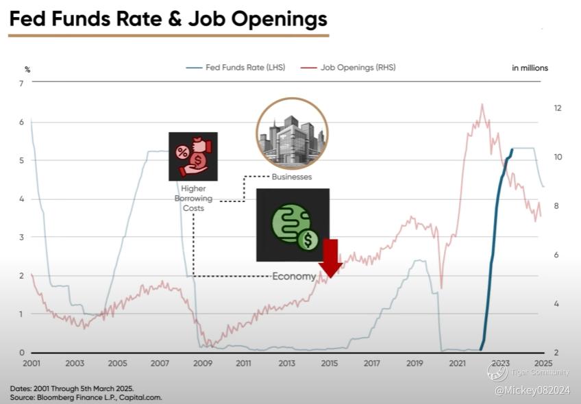 Looking at the job openings data in the U.S., we see a steady decline since its peak in March 2022, suggesting that wage growth is likely to continue its downward trend. If wage growth continues to fall, it would put downward pressure on inflation. However, there is an important caveat: if we replace the wage growth chart with the FED funds rate, we can see that the Federal Reserve began raising interest rates in March 2022. This marked the point when the job market began to cool down because higher rates increased borrowing costs for businesses, slowing economic activity. In 2021, businesses could easily secure loans at near-zero interest rates to expand and hire new employees, but by 2022, these opportunities dried up as borrowing became more expensive and less accessible.