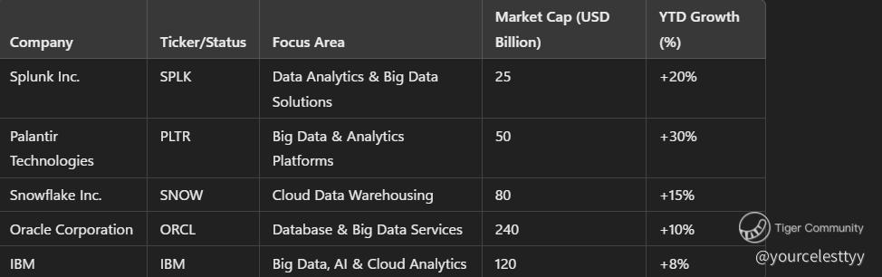 Below is a table summarizing some leading companies in the big data space, along with their focus areas and key performance metrics: