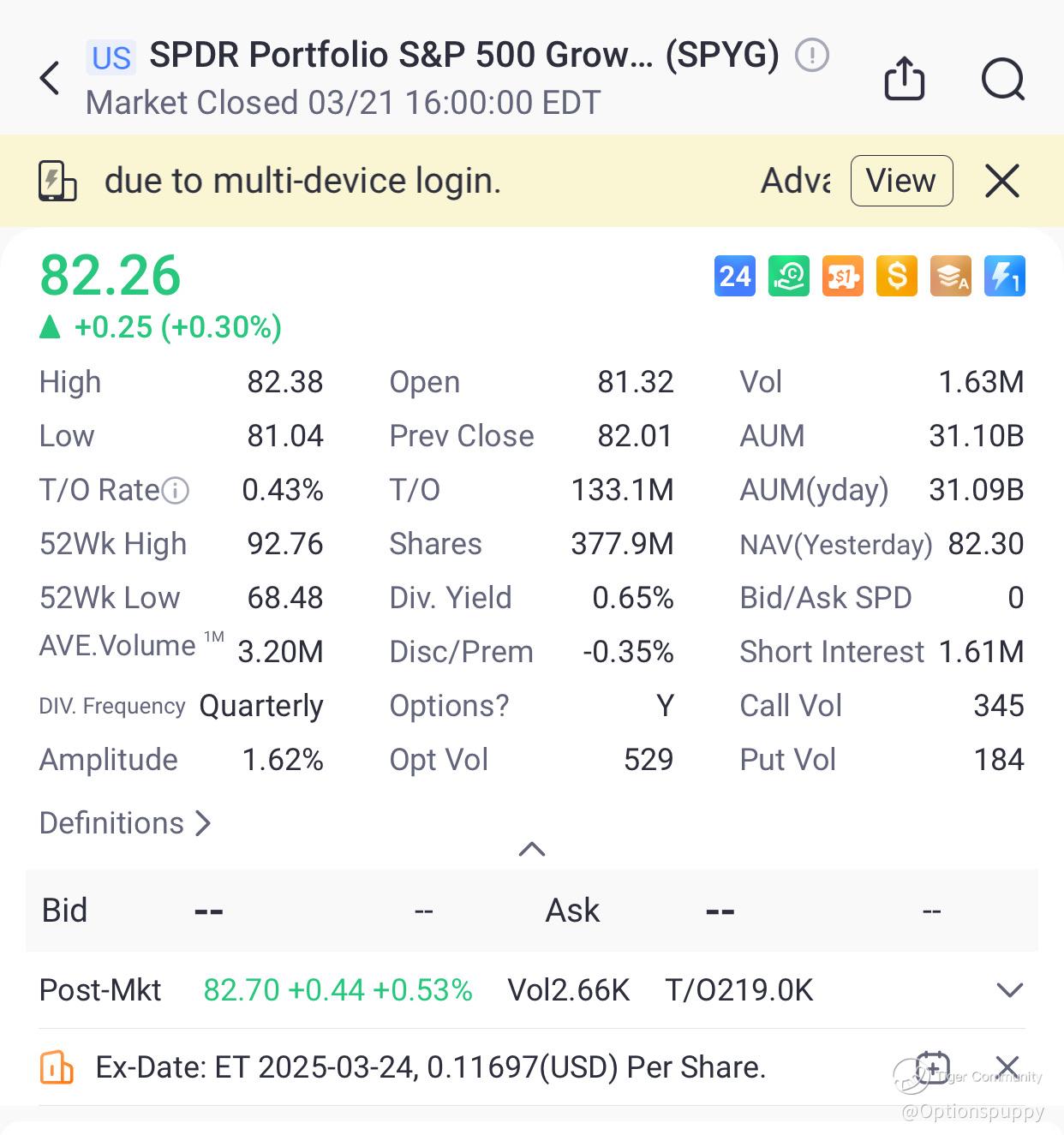 3. **Capture the Dividend**: SPYG has a dividend yield of 0.65%, and I plan to capture the dividend of $0.116 per share before the ex-dividend date. This dividend will be received if I hold the shares through the ex-dividend date.