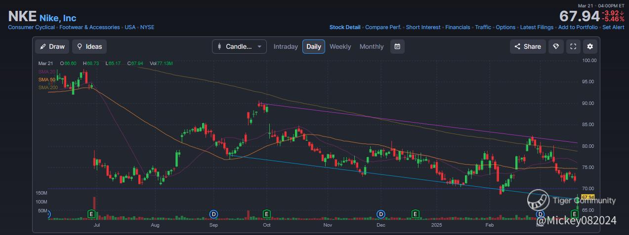 Looking at Nike’s current trading levels—similar to the March 2020 pandemic crash, August 2024’s Black Monday, and even just a month ago—it does seem justified. The company faces greater uncertainties, increased competition, and lacks positive momentum. However, Nike remains an iconic global brand, recognized worldwide, whether through genuine or counterfeit products.