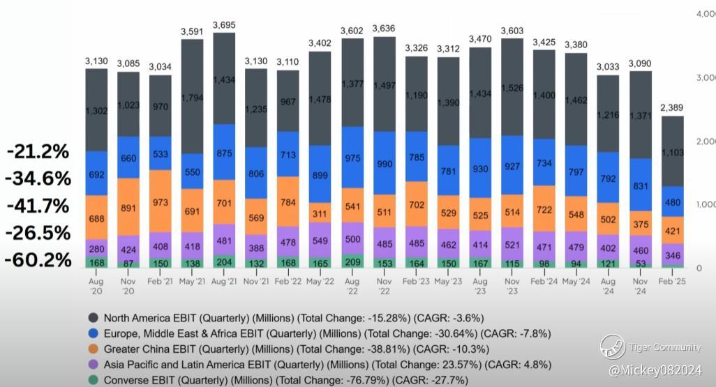 Global Sales Slump: Even though Nike has a strong global presence, the widespread decline in revenue across diverse markets signals potential issues in its ability to connect with consumers and maintain market share globally.