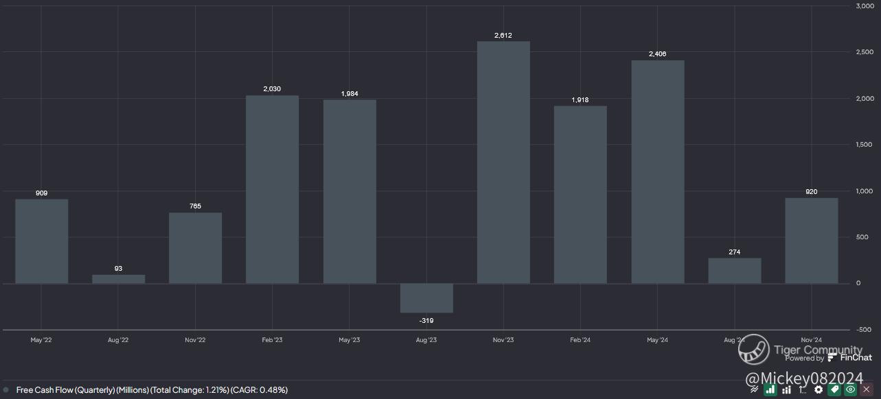 As of the most recent available data, Nike's free cash flow remained strong, despite the challenges in its core operations. For example, in its last earnings report, Nike reported a decline in sales, but still generated a positive cash flow, largely due to its efficient supply chain management, cost-control measures, and strong brand equity. Historically, Nike has maintained solid free cash flow, which allows it to reinvest in the business, pay down debt, and return value to shareholders via dividends and share buybacks.
