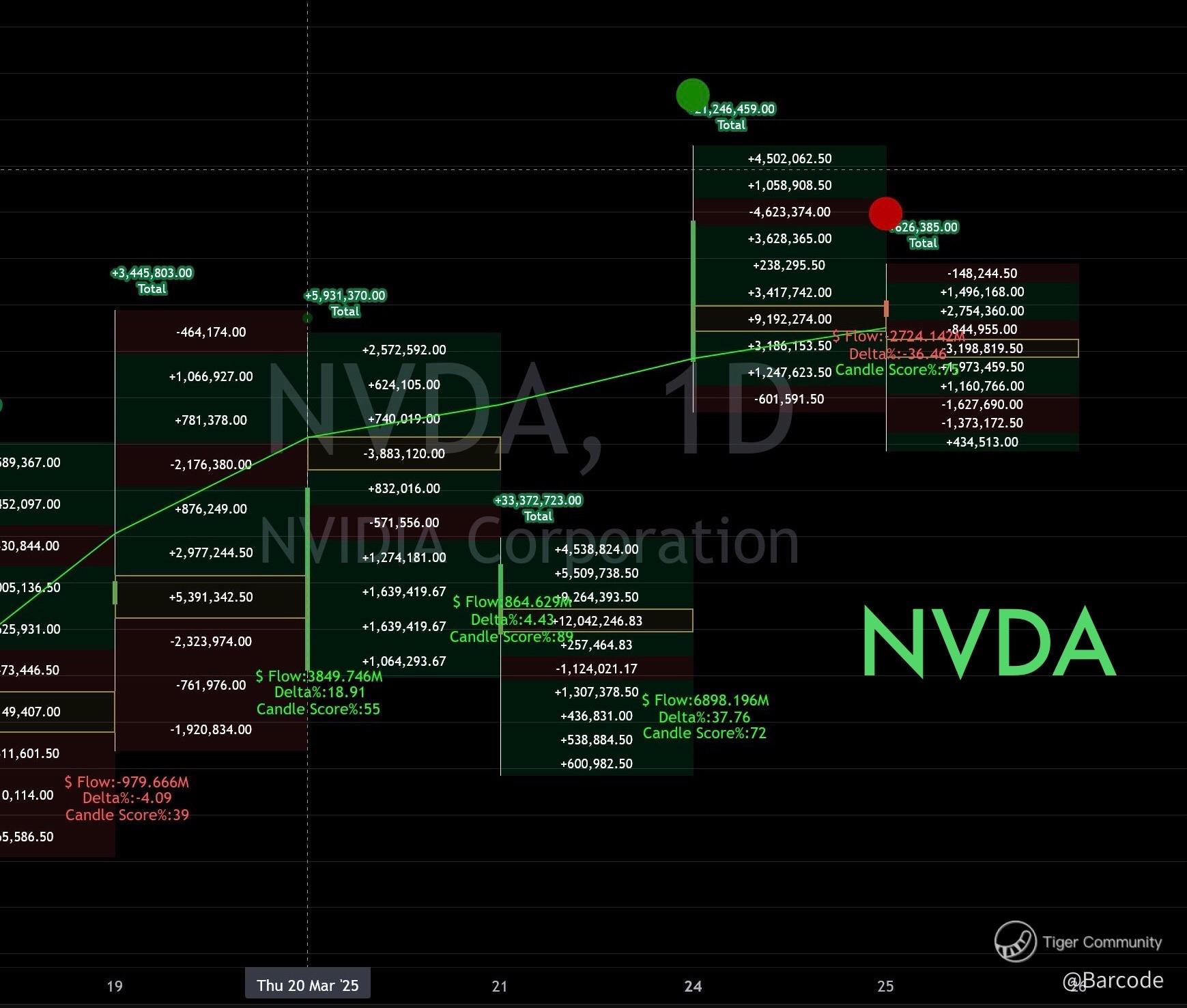 Still not convinced? Check the tape. $NVDA’s chart is a thing of beauty: after a brief wobble, it’s been climbing steadily, hitting a peak of 5,771,555.00 on March 25. Even the dip to 4,333,372.00 on March 26 keeps it well in the green. Dig into the metrics, massive inflows, a candle score of 979.469, and a delta of 118.91, and it’s clear: buyers are all in.
