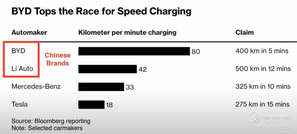 China’s automakers are no longer just copying Western designs—they are leading the charge in innovation. BYD’s fast-charging technology is the best in the world, offering 400 km of range in just five minutes. In contrast, Tesla lags far behind, with charging speeds twice as slow as BYD’s. The only real competition for BYD comes from another Chinese automaker, Li Auto, further proving that China’s EV market is years ahead of the West.