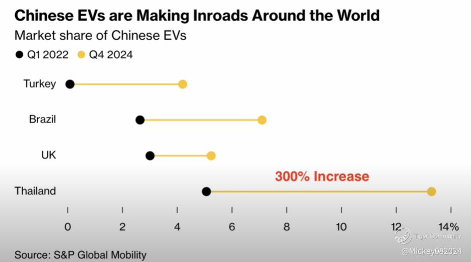 Trump’s trade policies aren’t just making domestic production more expensive—they’re also fueling global resentment toward American-made products. While governments might hesitate to impose retaliatory tariffs, consumers have the power to simply stop buying U.S. goods. In markets from Turkey to Brazil and Thailand, Chinese EVs are rapidly gaining traction, doubling or even tripling their market share in just two years.